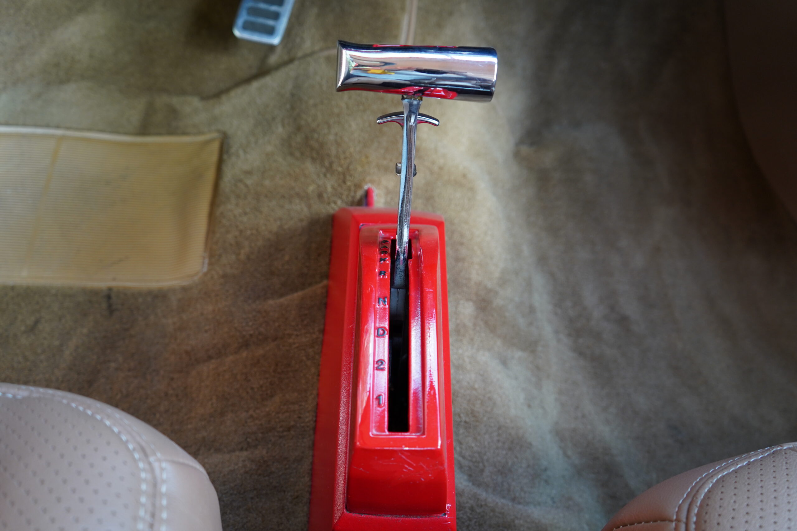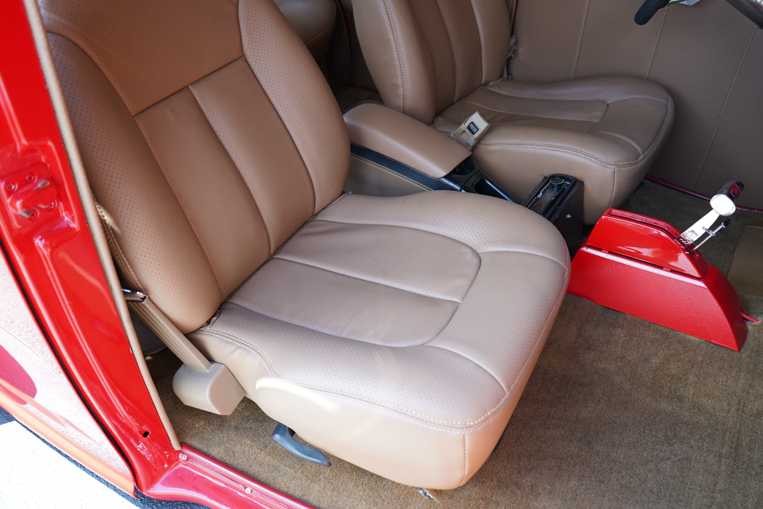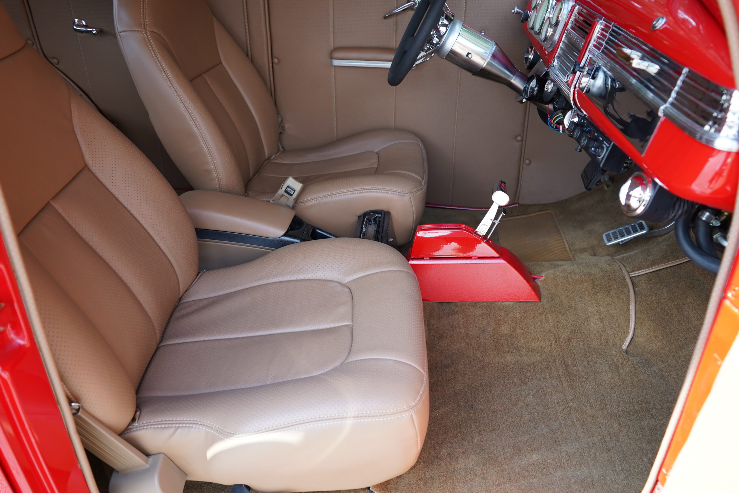 Step inside and enjoy plush tan leather bucket seats and a custom center console with a CD player. The B&M ratchet-style Z shifter adds a sporty touch, enhancing the driving experience.