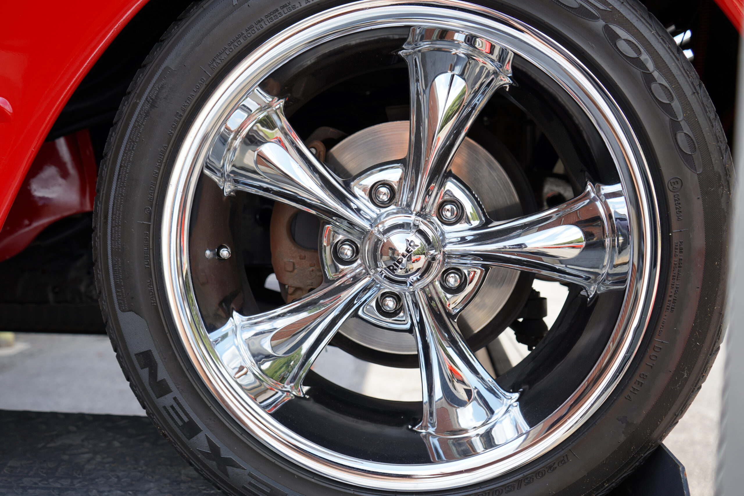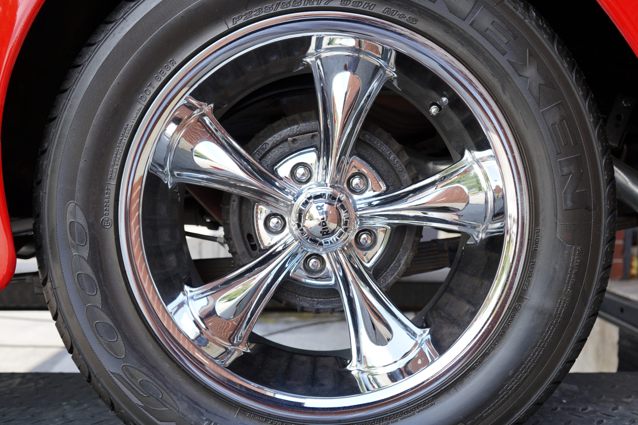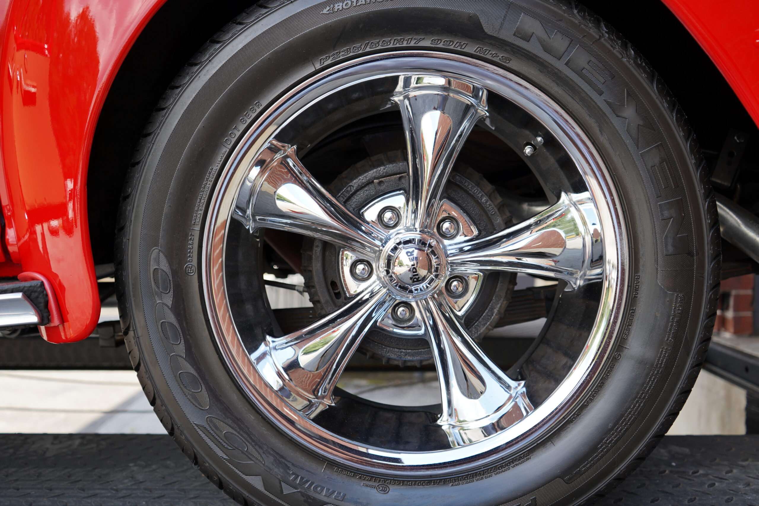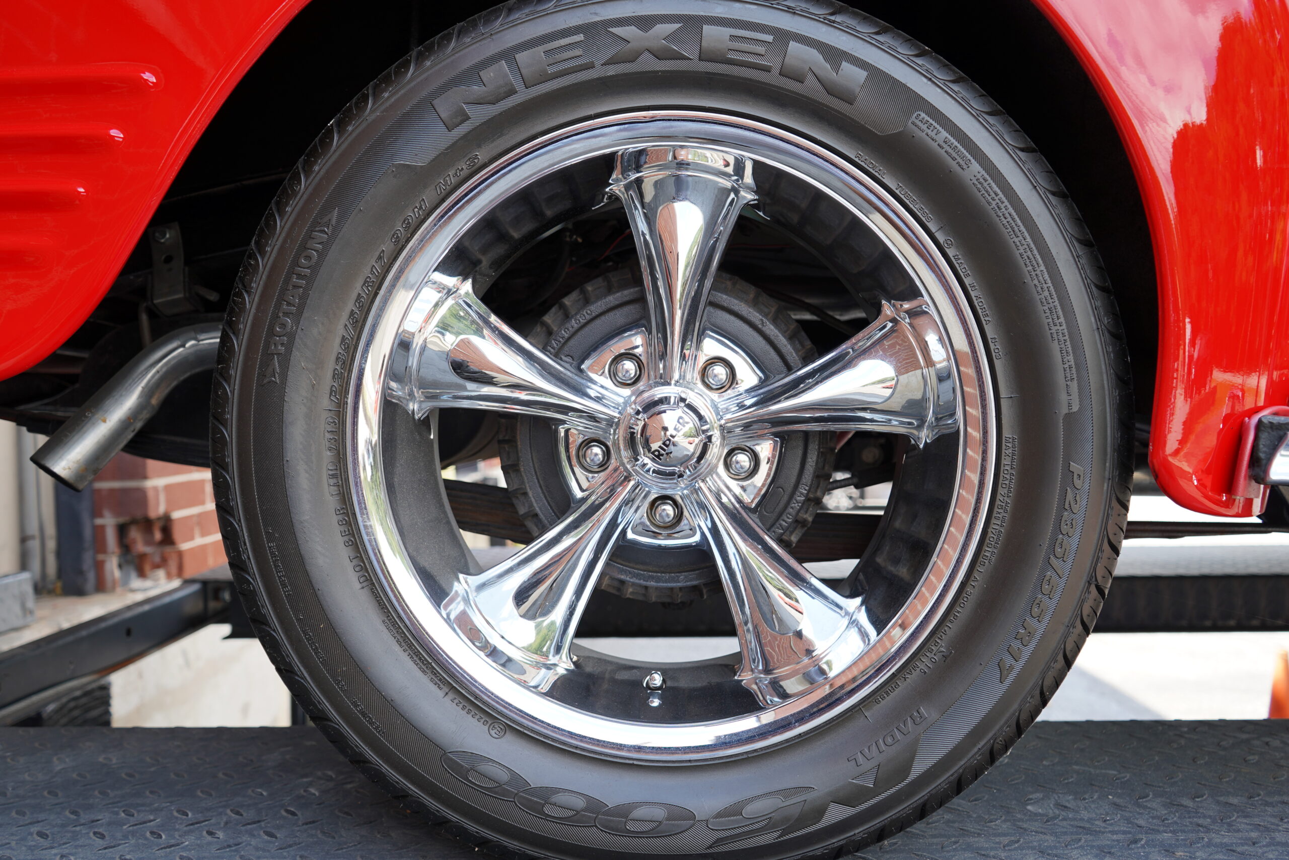 This Dodge rides on custom 17-inch Ridler chrome wheels wrapped in Nexen N5000 tires, offering both style and stability. The braking system includes disc brakes up front and drum brakes at the rear, providing excellent stopping power.