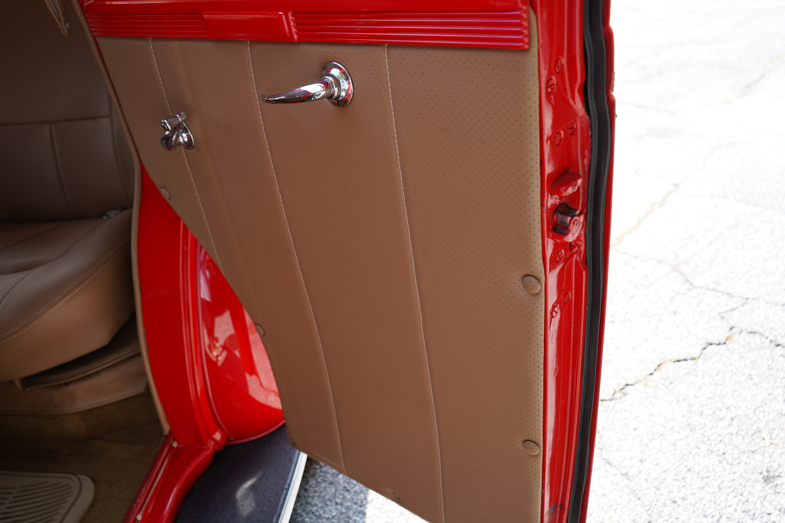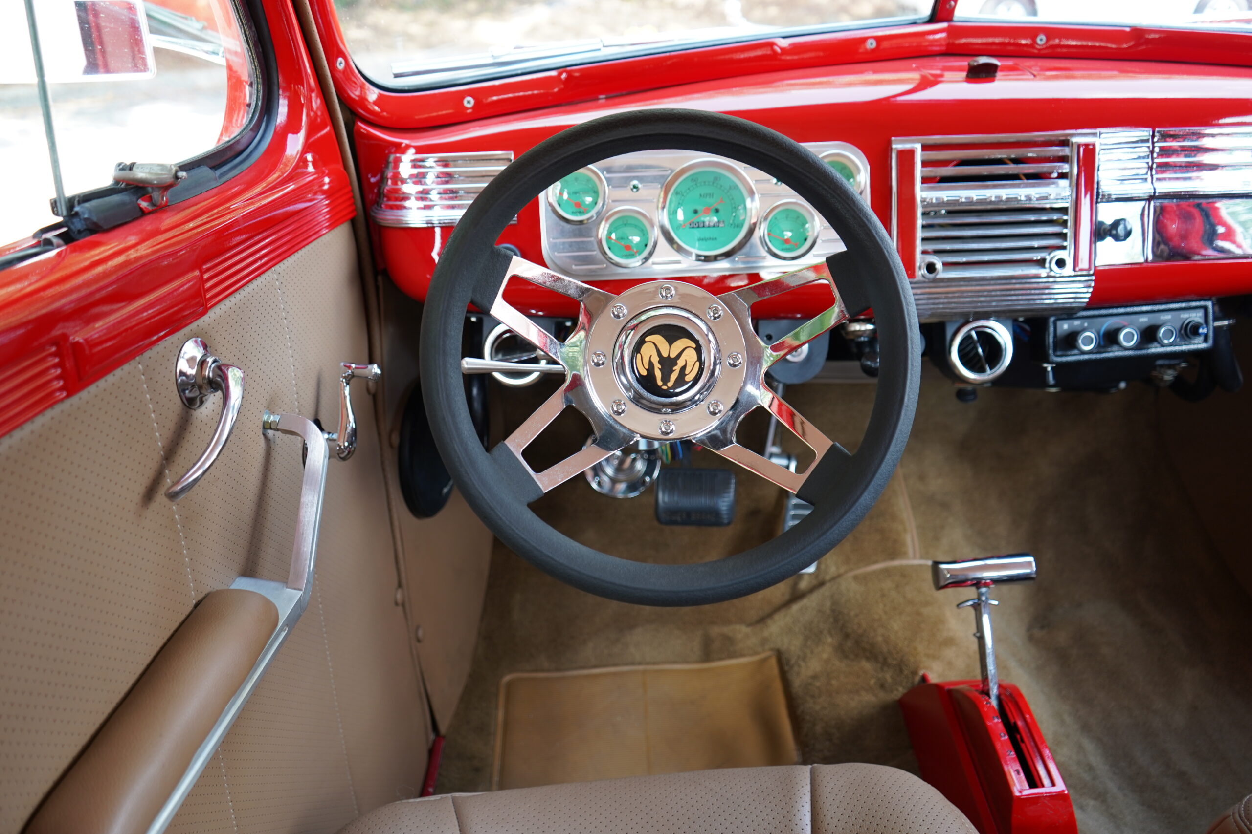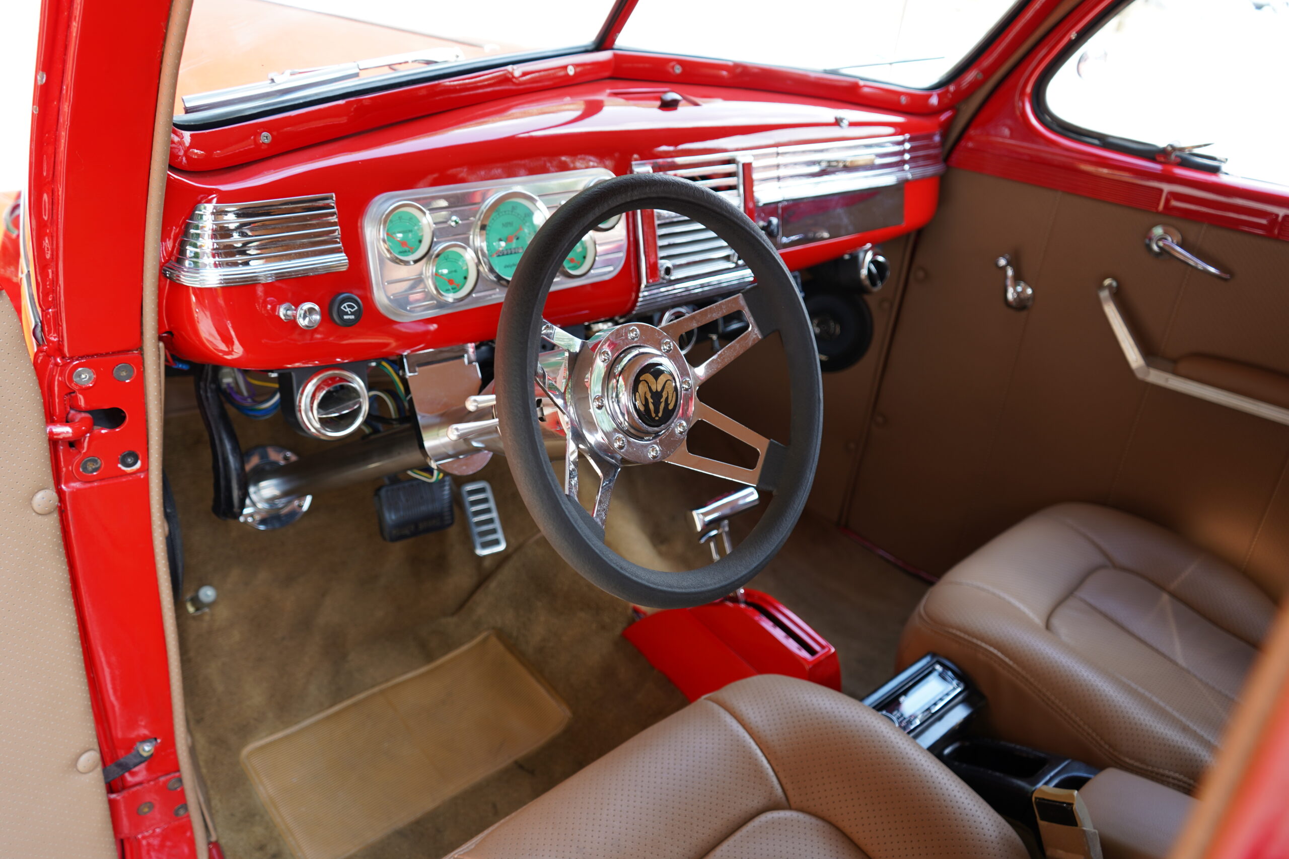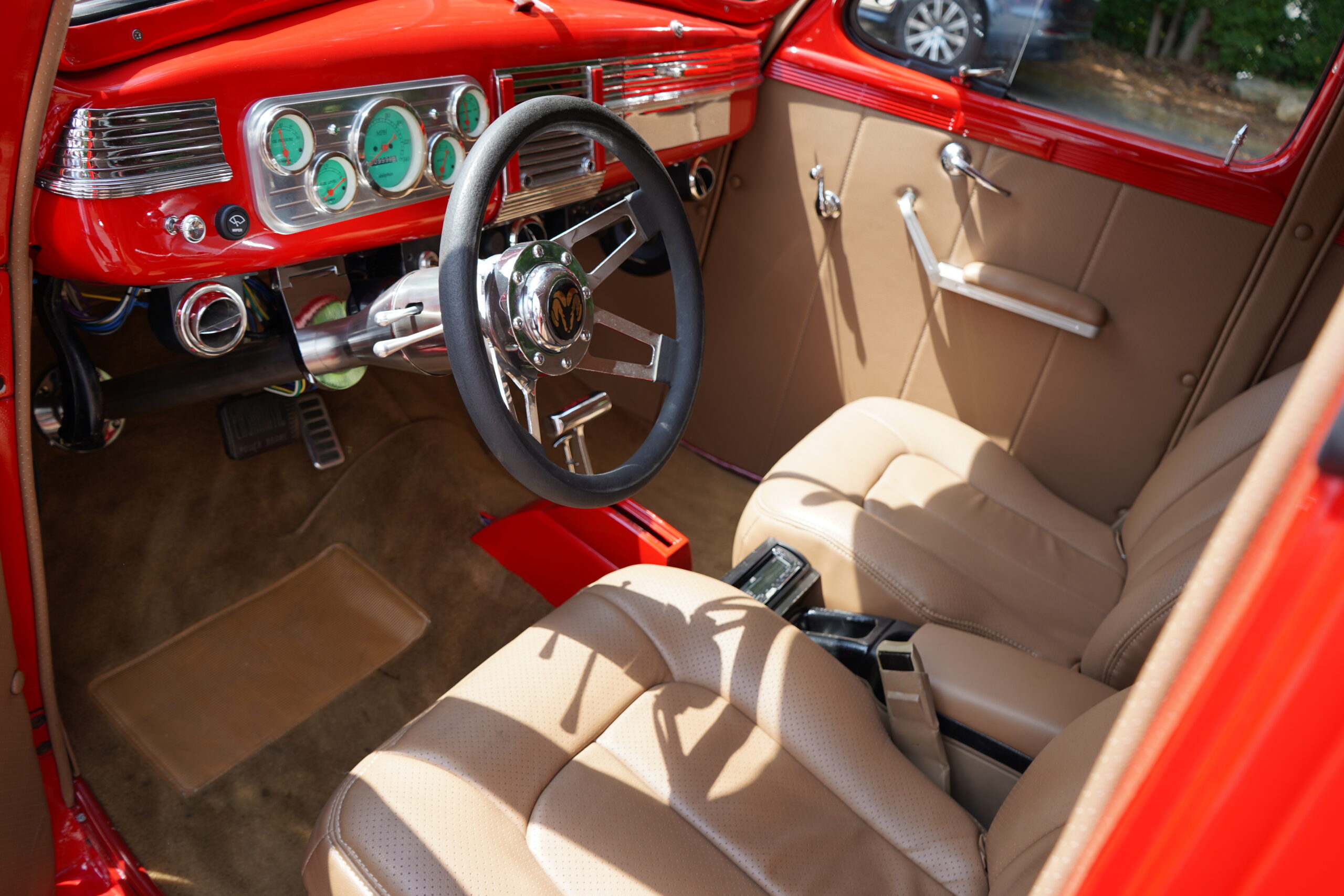 Finished in striking Torch Red, this Dodge D11 showcases a flawless paint job highlighted by custom chrome accents and contrasted with a luxurious tan leather interior. Every detail reflects quality craftsmanship, making this D11 a true standout on the road or at any show.