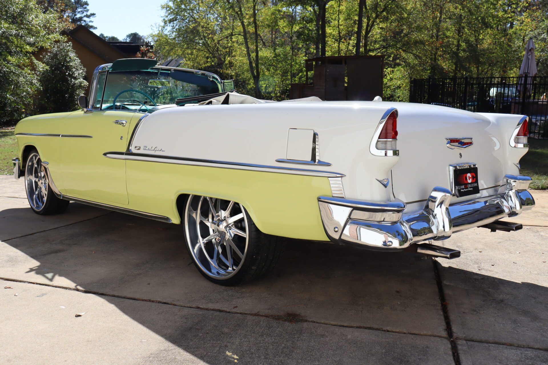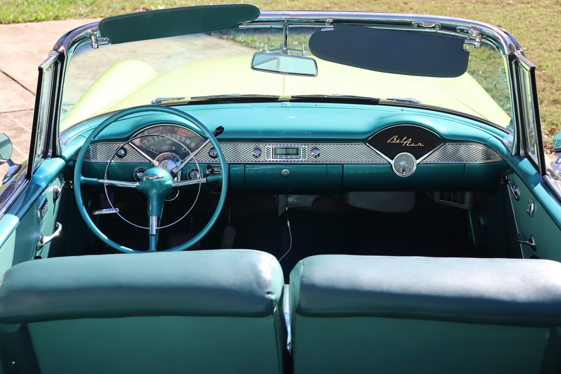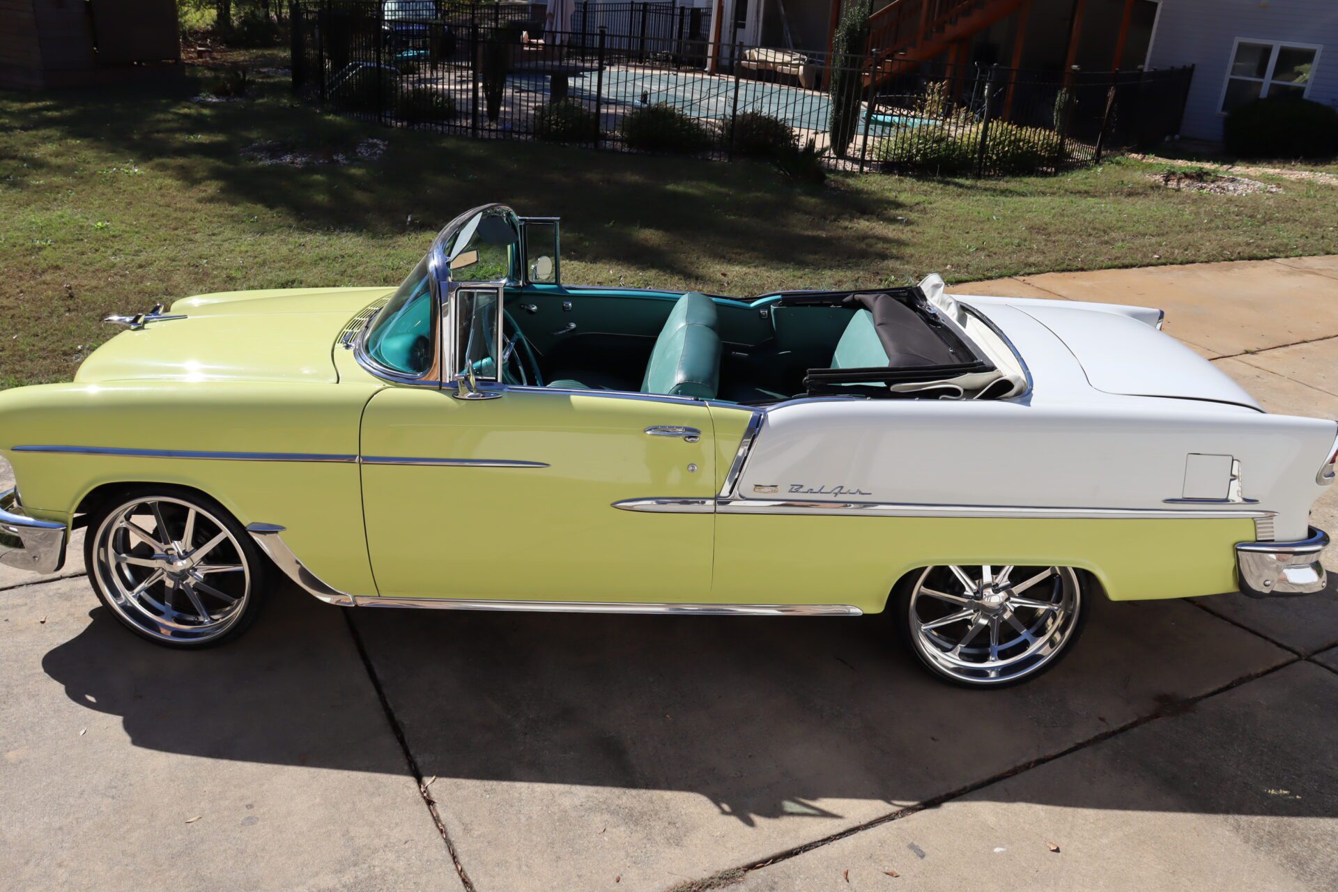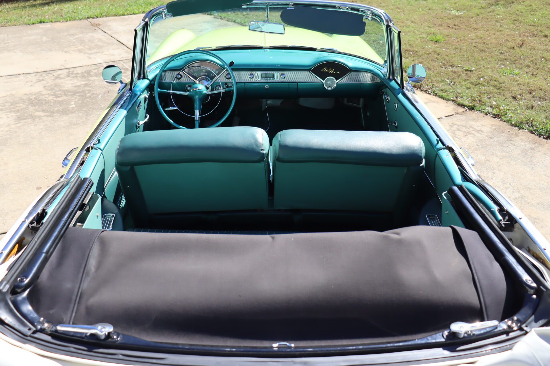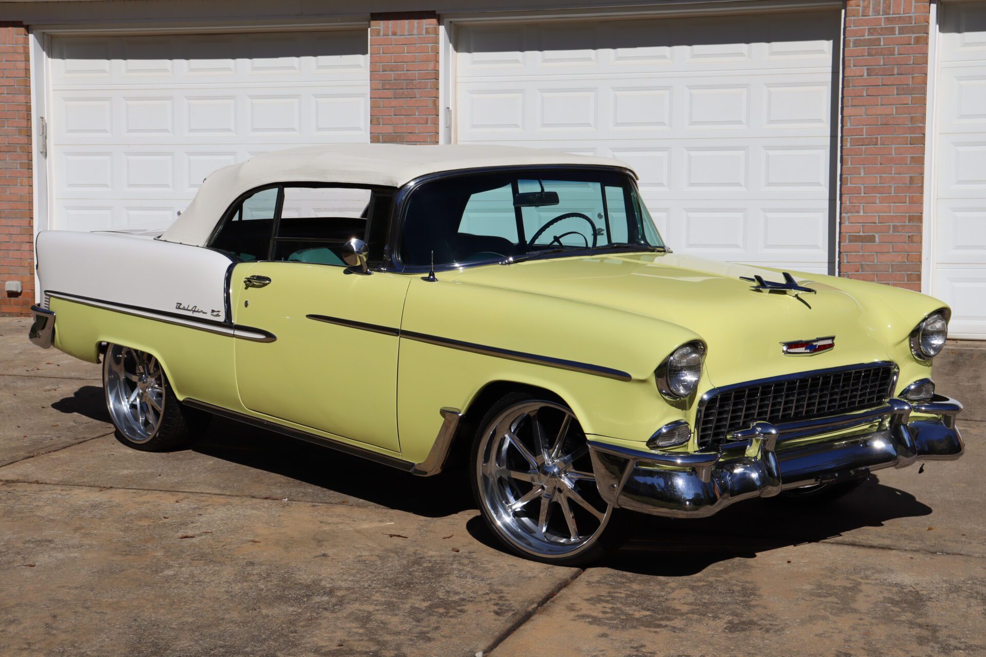 Turn heads and make a statement with this stunning 1955 Chevrolet Bel Air Convertible, a true icon of American automotive history. This classic car stands out with its rare and eye-catching color combination of vibrant yellow and pristine white on the exterior, perfectly complemented by a luxurious emerald green interior that exudes vintage charm.