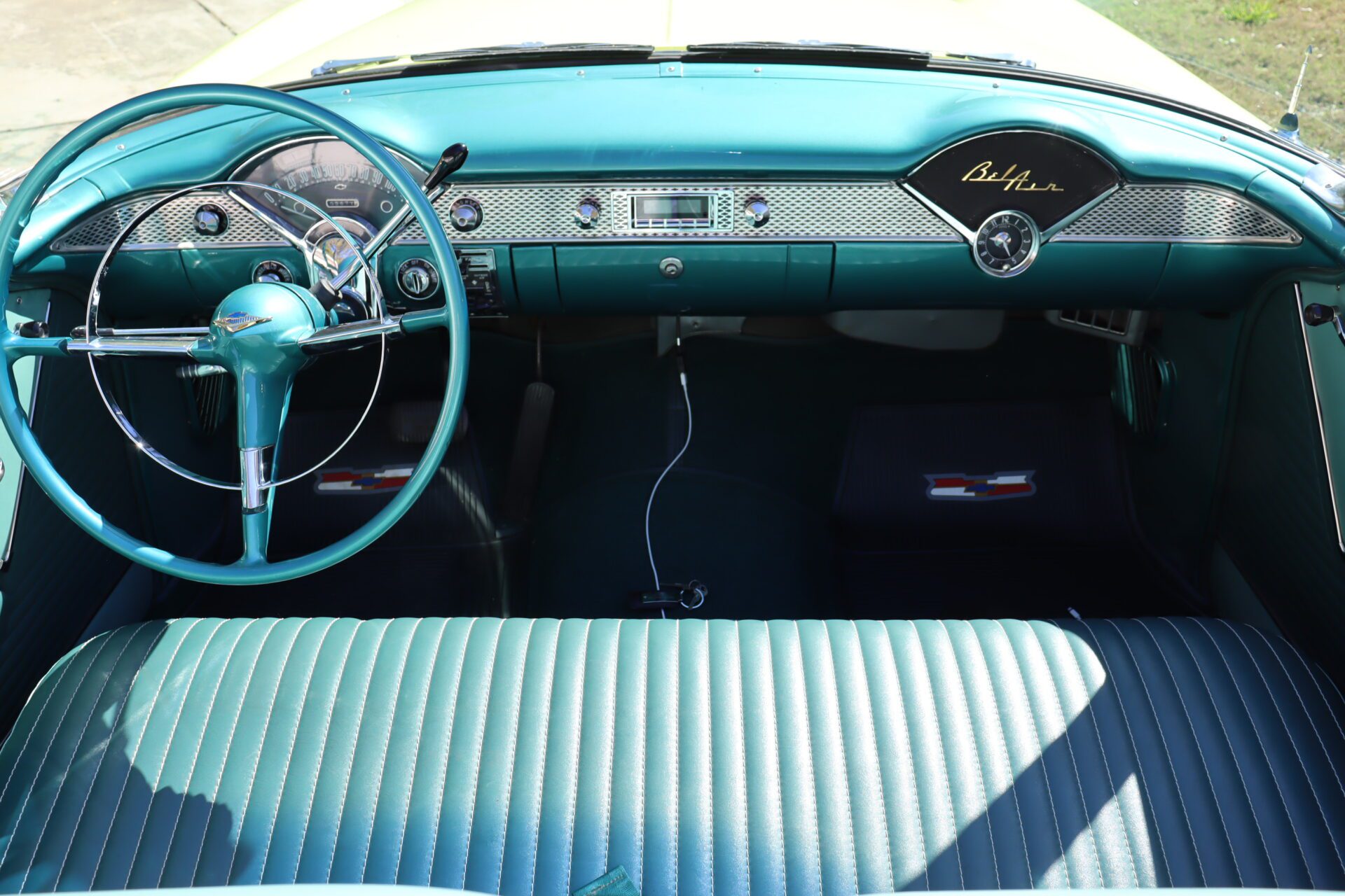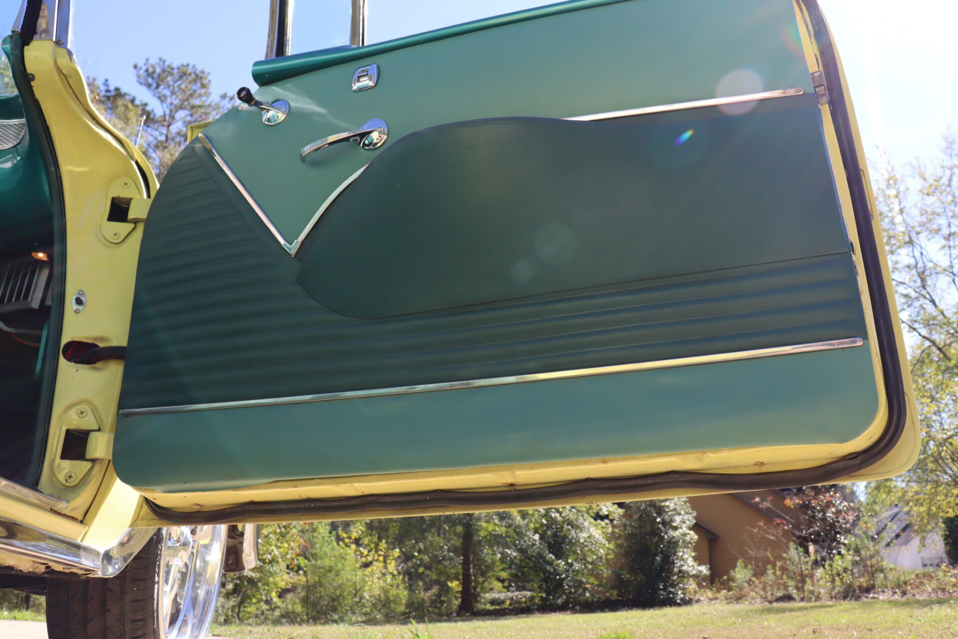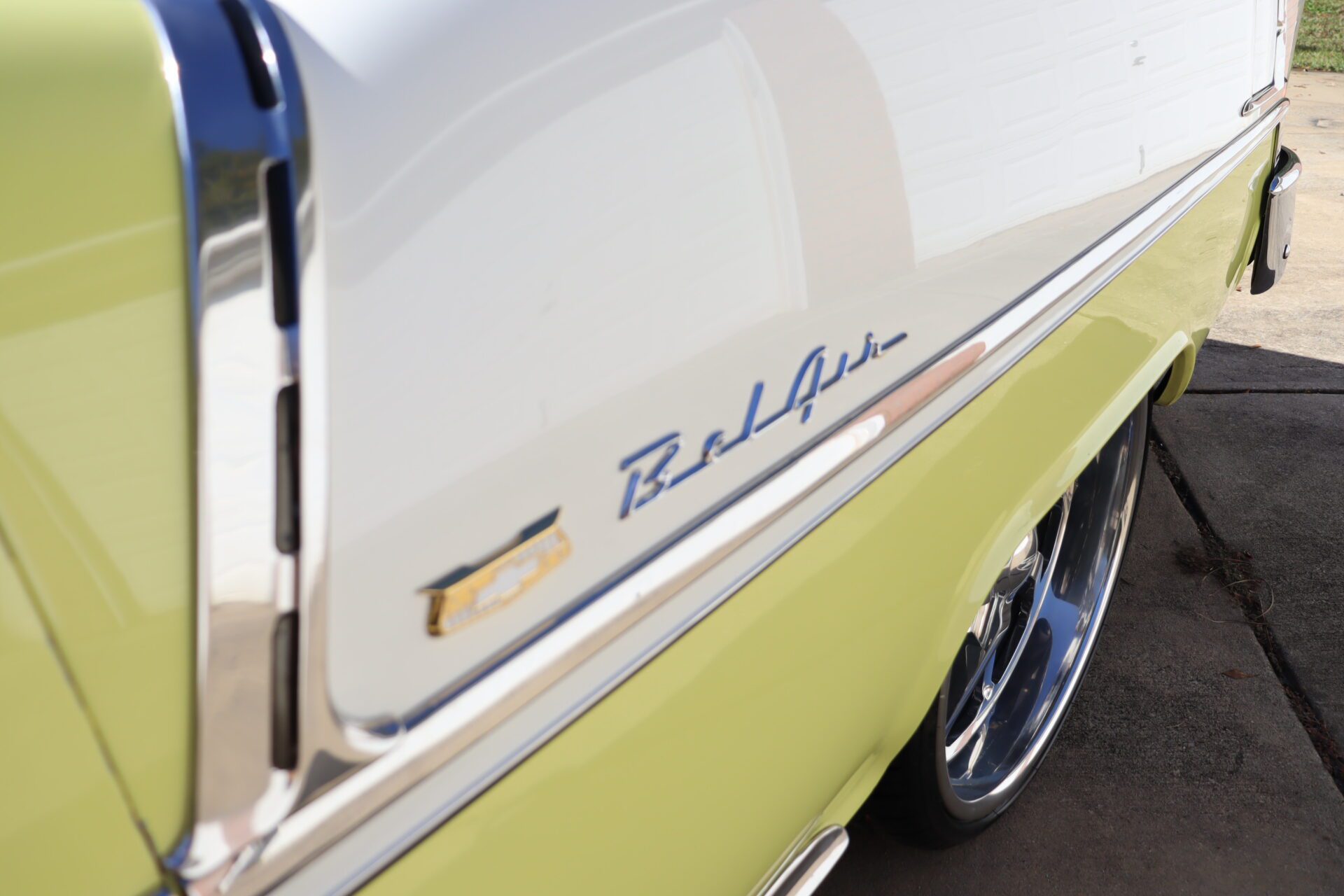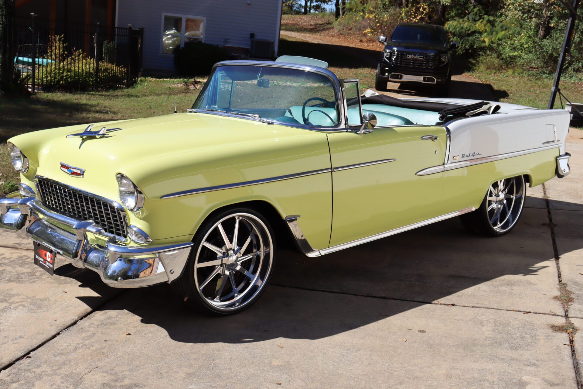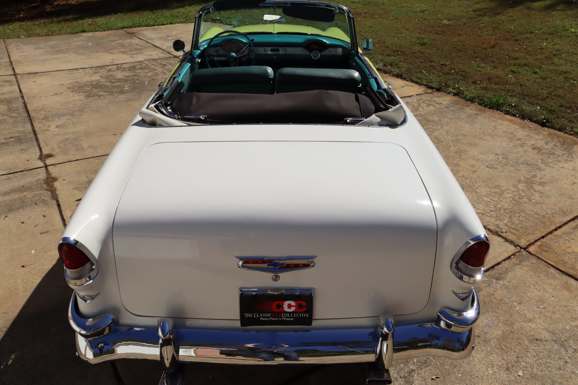 Turn heads and make a statement with this stunning 1955 Chevrolet Bel Air Convertible, a true icon of American automotive history. This classic car stands out with its rare and eye-catching color combination of vibrant yellow and pristine white on the exterior, perfectly complemented by a luxurious emerald green interior that exudes vintage charm.