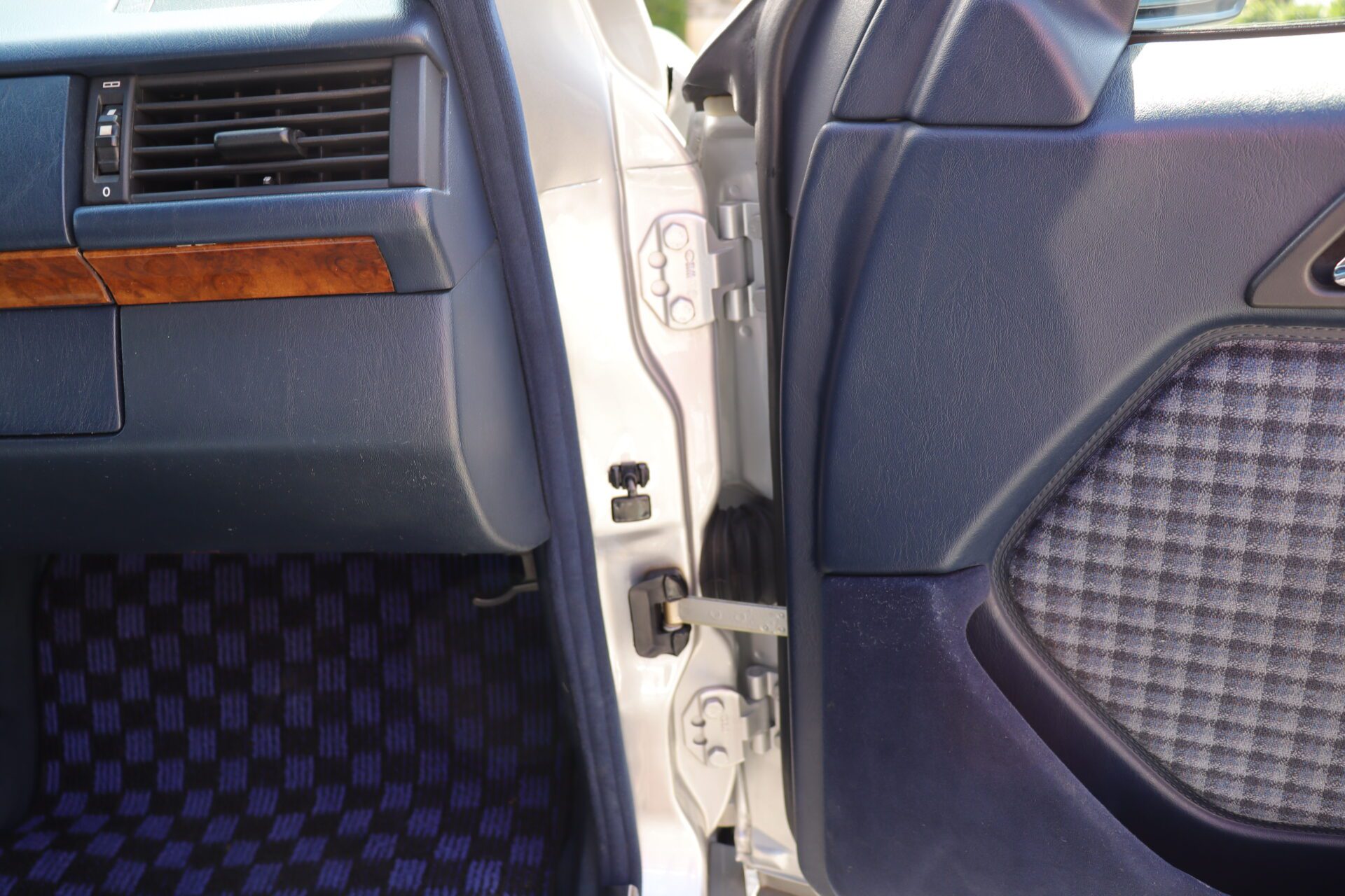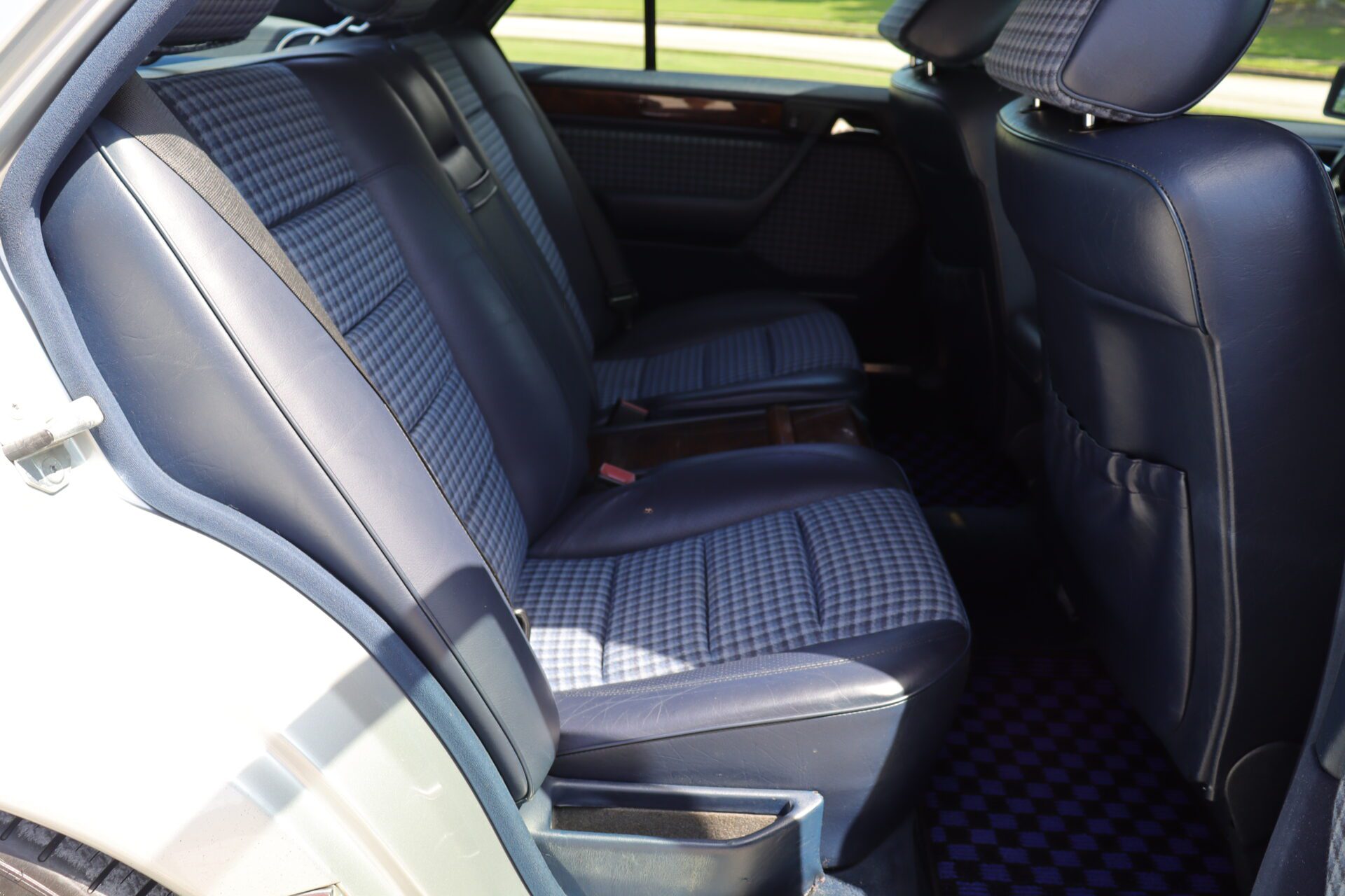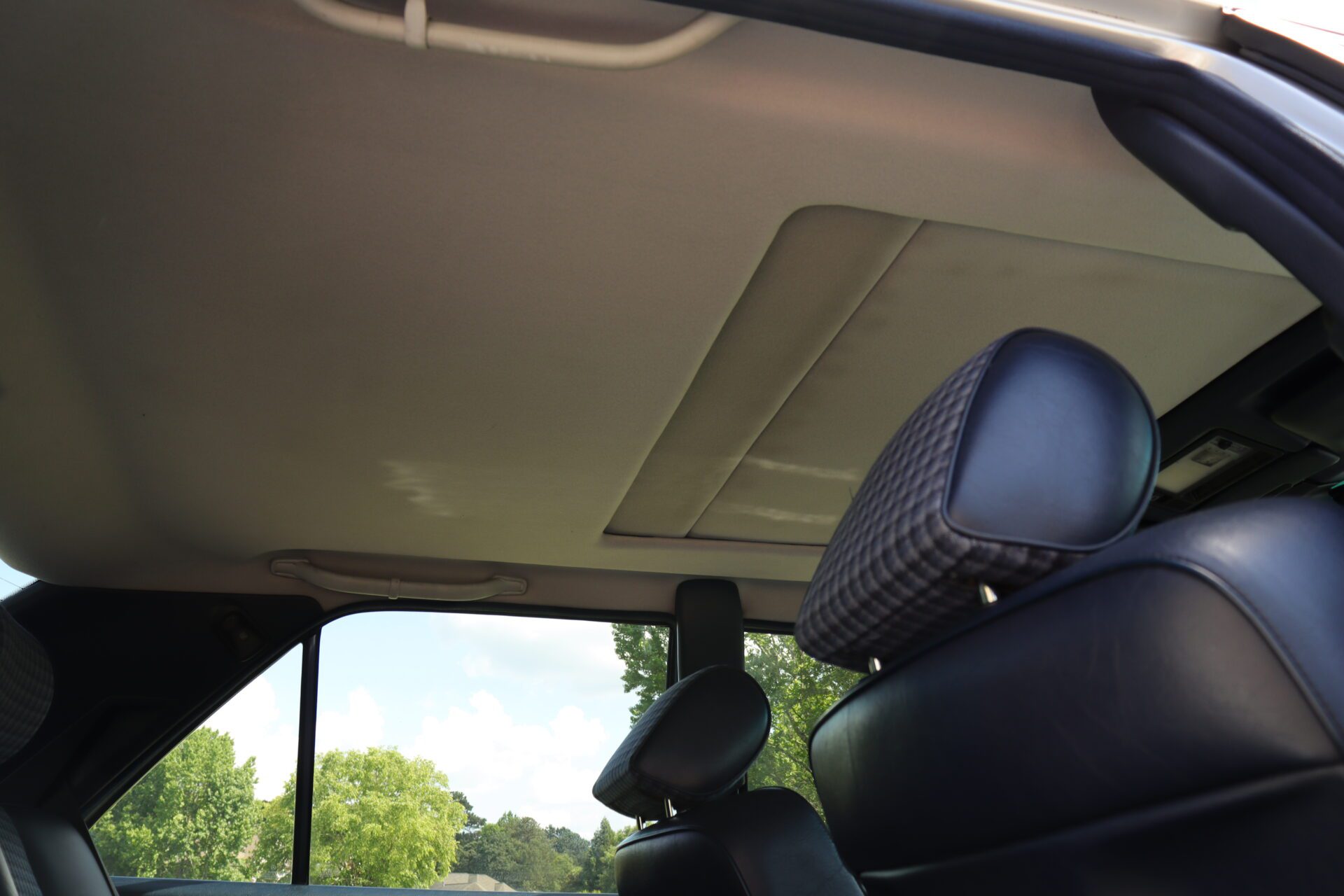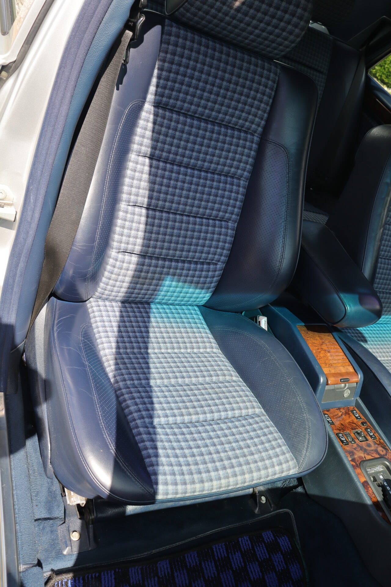 Interior is one of the rarest you can find on these cars. Code for the interior is 072 which is fabric blue inserts with leather perforated bolsters, and it looks absolutely phenomenal. The seats show like new with practically no bolster wear. These seats also happen to be heated which was pretty advanced for the year. Dash is in great condition no lifting or warping or cracks. Original radio has been upgraded to a more modern head unit with blue tooth. Rear seats are as clean as the front seats. The headliner is in excellent shape as the car has never been smoked in and the headliner also is not sagging. The sunroof and power windows all function as they should. Car has functional AC and functional heater. All the glass looks good no chips or cracks.